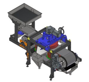 The MAGQUIP VOG 400 Rapid Disc Separator is an advanced high performance sorting system featuring up to three independently operating electromagnetic discs capable of generating magnetic field strengths of up to 14,000 gauss each. These powerful magnetic forces enable the extraction of paramagnetic particles from a free-flowing, dry product stream ranging from 100μm to 1.5mm in size. The Separator has a modular construction. It can be made to incorporate up to three high-intensity electromagnetic discs, each positioned at varying heights above a 400mm wide belt conveyor. The first disc is strategically set furthest from the feed material to capture the most magnetically susceptible particles. Subsequent discs are positioned at progressively lower gaps, increasing magnetic field intensity and facilitating the separation of different grades of magnetic material. Adjusting the disc angle and coil current of each coil allows the Separator to be highly customisable so that it can meet specific mineral separation requirements.